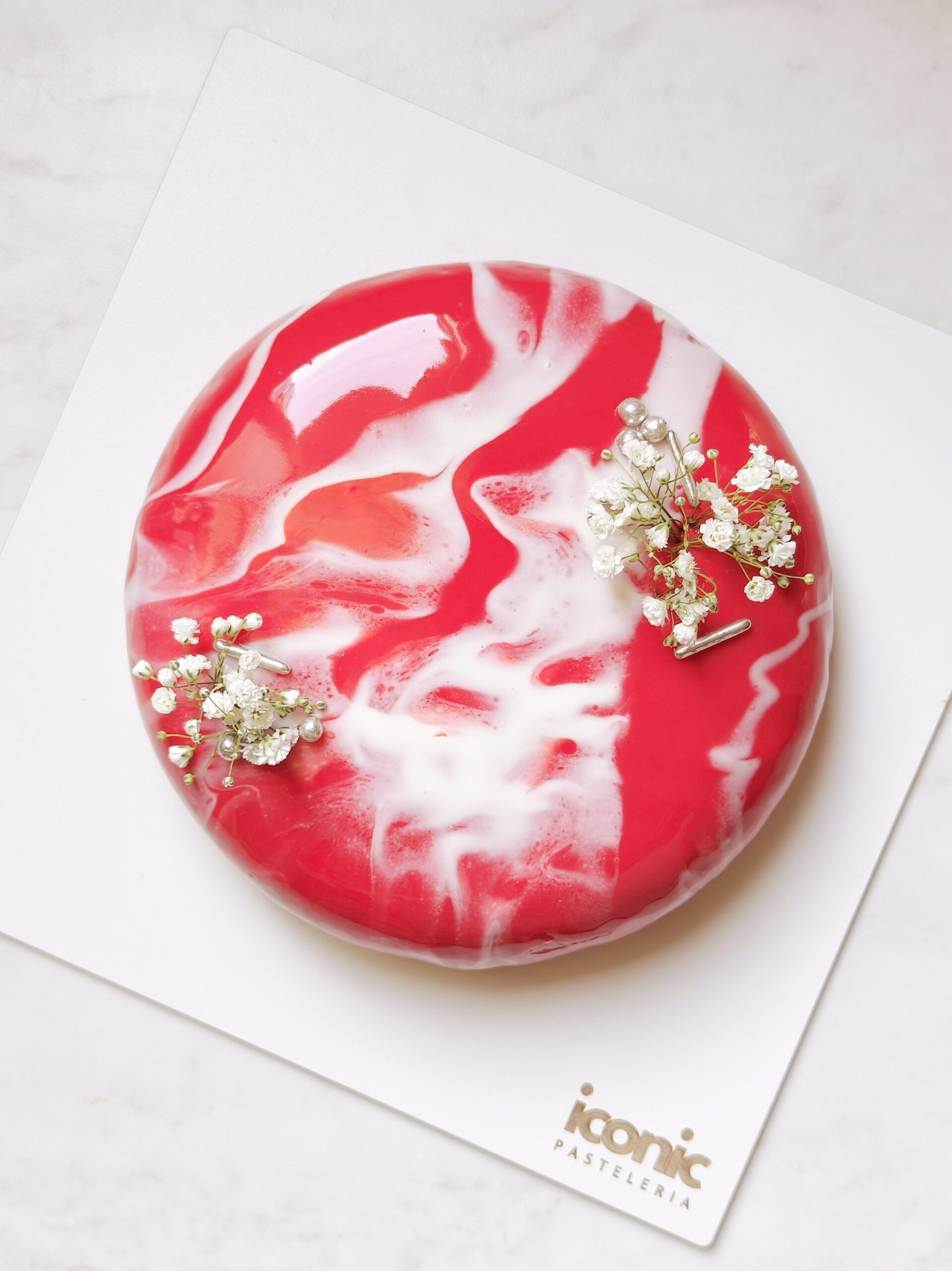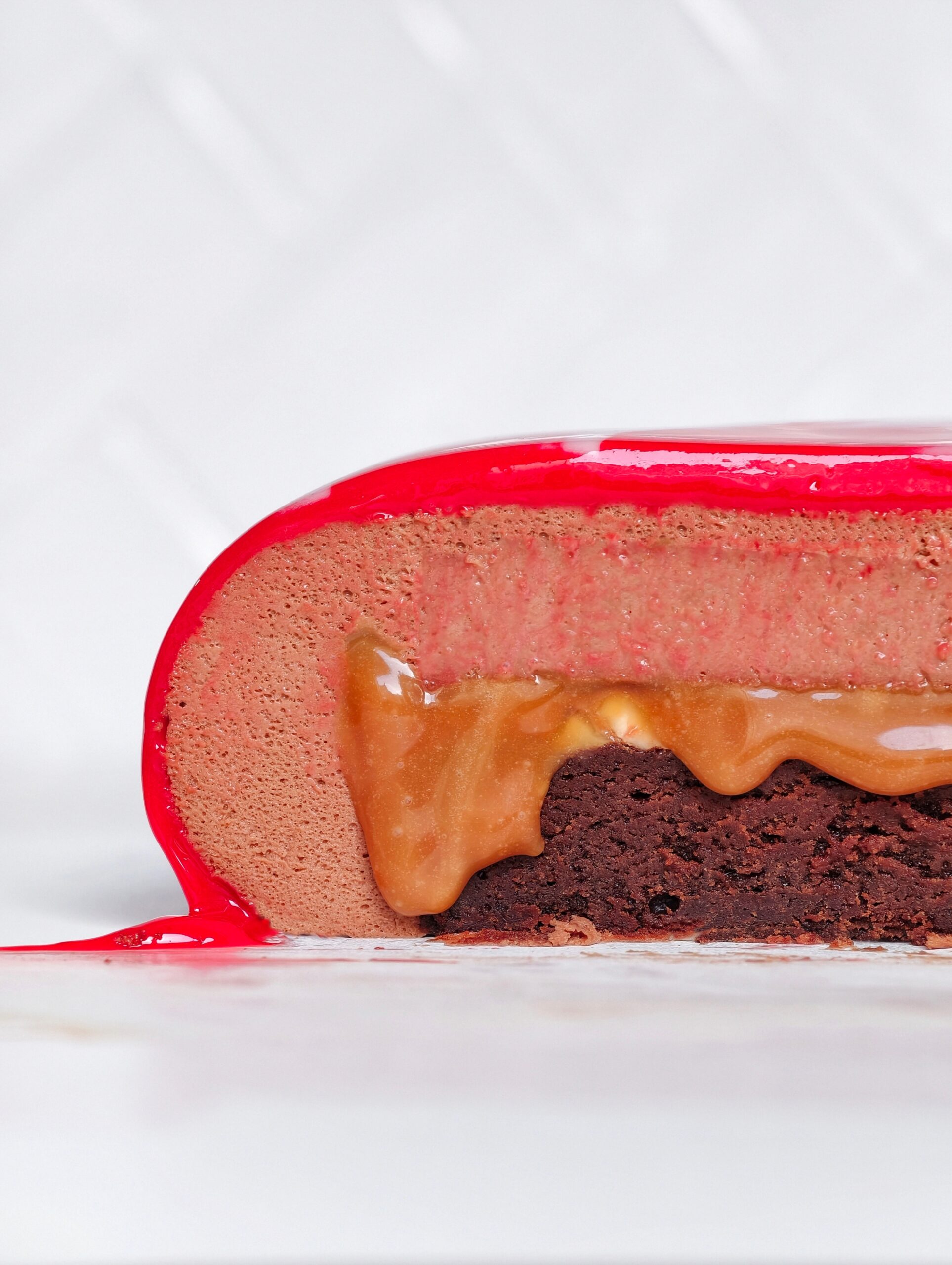 La base de brownie con avellanas añade textura y carácter, todo cubierto con un brillante glaseado espejo.